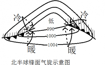锋面气旋:总结:1、反气旋(高压)气流向外辐散,不能形成锋面;2、南北半球左侧的低压槽都为冷锋,右侧为暖锋;3、北半球冷
