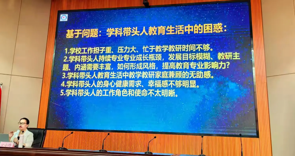讲座伊始,金老师基于问题,提出了学科带头人教育生活中的困惑主要有以下五个方面:一是学校工作担子重、压力大、忙于教学教研时间不够;二是学科带头人持续专业专业成长瓶颈,发展目标模糊、教研主题、内涵需要丰富,如何形成风格,提高教育专业影响力;三是学科带头人教育生活中教学教研家庭兼顾的无助感;四是学科带头人的身心健康需求、幸福感不够明显;五是学科带头人的工作角色和使命不太明晰。