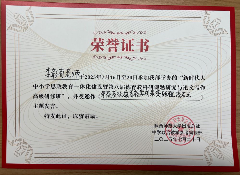 另外,通过参评去“摇动”。《奏响“七子”之歌 提升培养实效》在第七届名师工作室学术年会上获得全国名师工作室建设成果一等奖。论文《用教育理念抒写成长的精彩》在“教学月刊·2025年中学学科教研与教师发展论文大赛”中被评为三等奖。