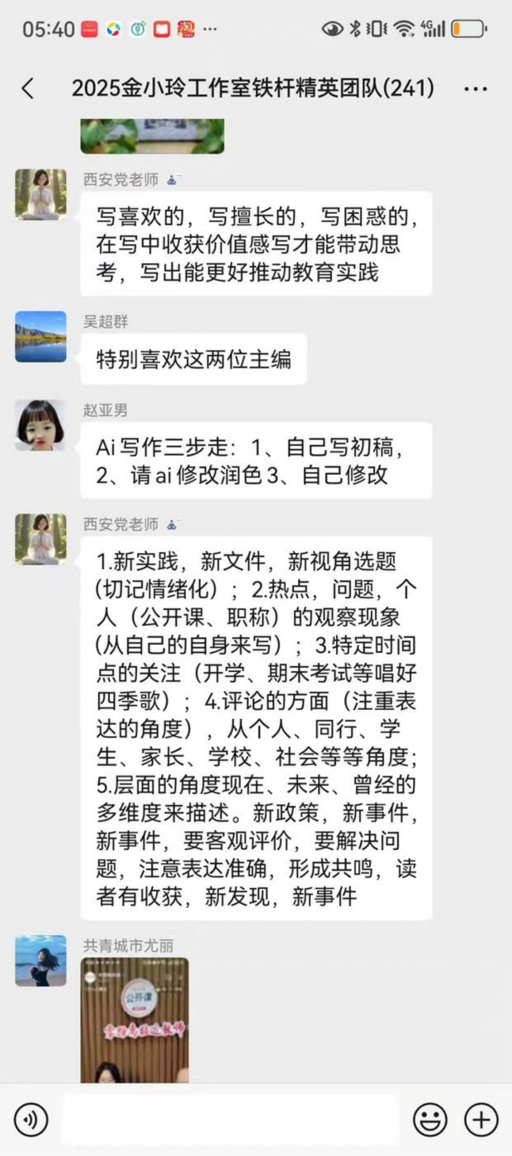 直播的余温,在各协办团队的群聊里凝成了滚烫的共鸣。老师们的分享如星子落满屏:有人说“终于敢提笔了——原来课堂上那声意外的笑、种植角那株西红柿的抽芽,都是最好的题眼”;有人言“原来随笔不是‘闲笔’,是藏着教育温度的自留地”;更有教育部新时代“双名计划”金小玲快乐英语名师工作室的成员们,在群中约定以“英语课堂的微叙事”为锚点,让写作与教学如双生花般共绽。