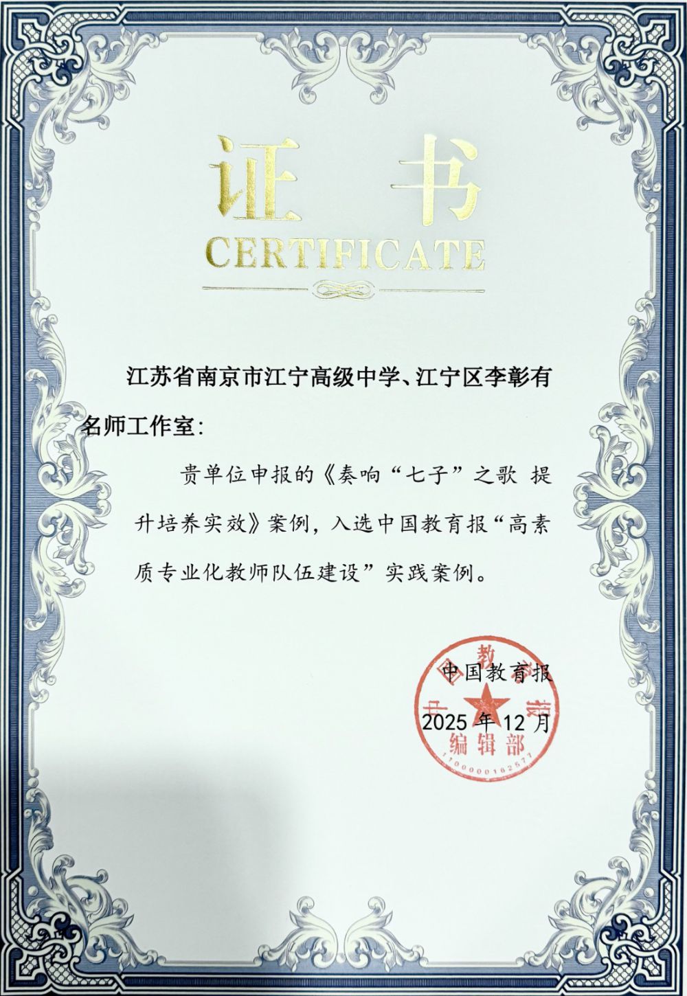 为发掘、宣传基础教育领域的强师好经验好做法,促进教师队伍建设经验交流和平台建设,2024年6月起,中国教育报以“高素质专业化教师队伍建设”为题面向地方教育行政部门、中小学校、教科所、名师工作室等进行典型案例征集,主题范围涵盖数字化赋能教师发展、优化教师资源配置、深化教师评价体系改革、教师团队文化建设、教师培训创新、教师教学能力提升、师德师风建设等,得到全国30个省(自治区、直辖市)的教育行政部门、学校、教科院(所)、教师发展研究中心、名师工作室等单位的积极响应。中国教育报组织成立专家组,进行三轮审核,最终遴选出100个典型案例、50个实践案例。李彰有名师工作室的提交的经验总结案例《奏响“七子”之歌 提升培养实效》,以其独特创新性、可资借鉴性、切实操作性,从全国30个省(自治区、直辖市)的报送的众多案例中脱颖而出,成功入选中国教育报“高素质专业化教师队伍建设”典型实践案例。
