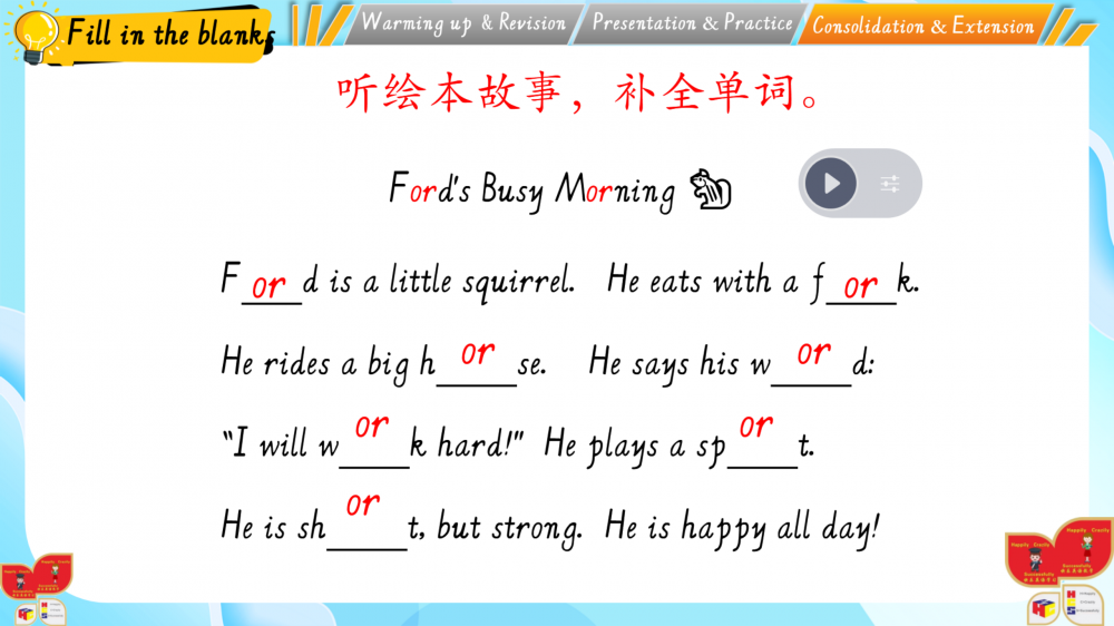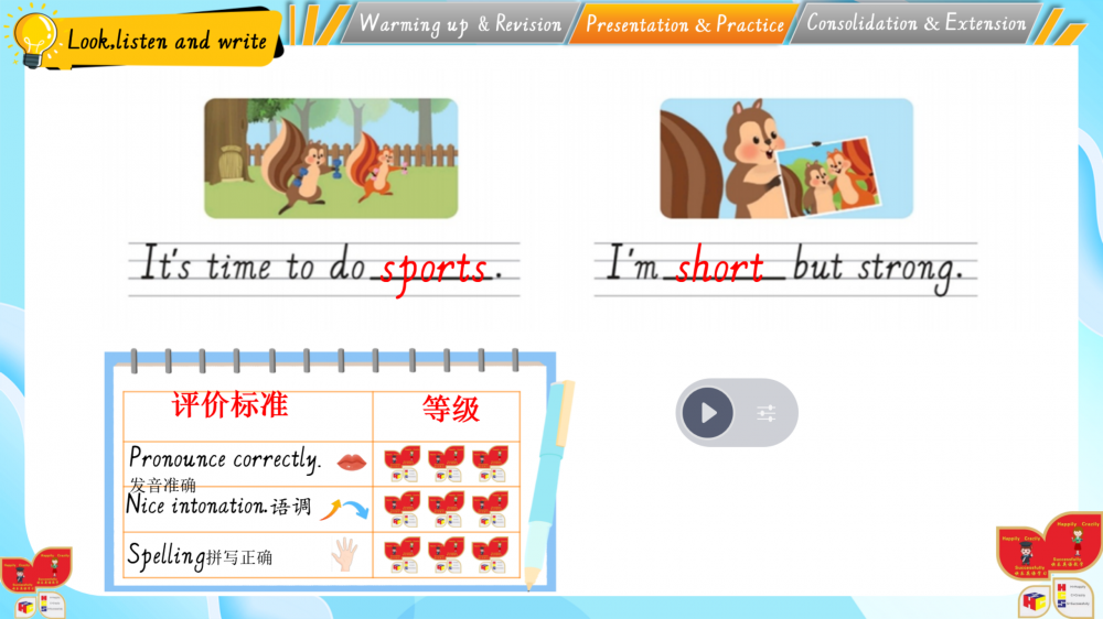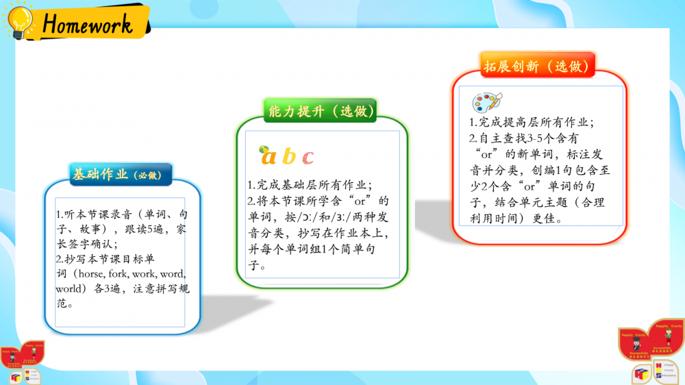 1. 以情境为基,通过动画、互动游戏还原生活场景(如家务劳动等),落实新课标“真实语境中学习语言”的要求;