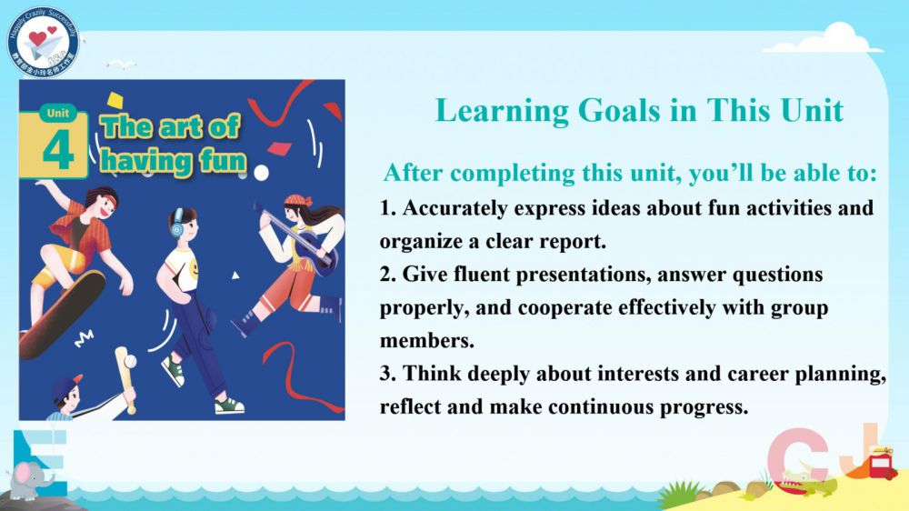 本期我们将推出由崔根萍、庄楠楠团队曹晶老师精心打磨的Unit 4 The art of having fun Period 6 (Presenting ideas & Reflection) 希沃教学课件。让我们携手共进,一同探索英语教学的无限可能!期待与您共同成长,让英语课堂绽放更多精彩!
