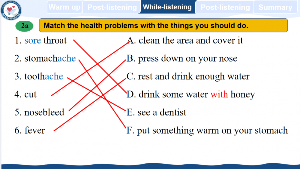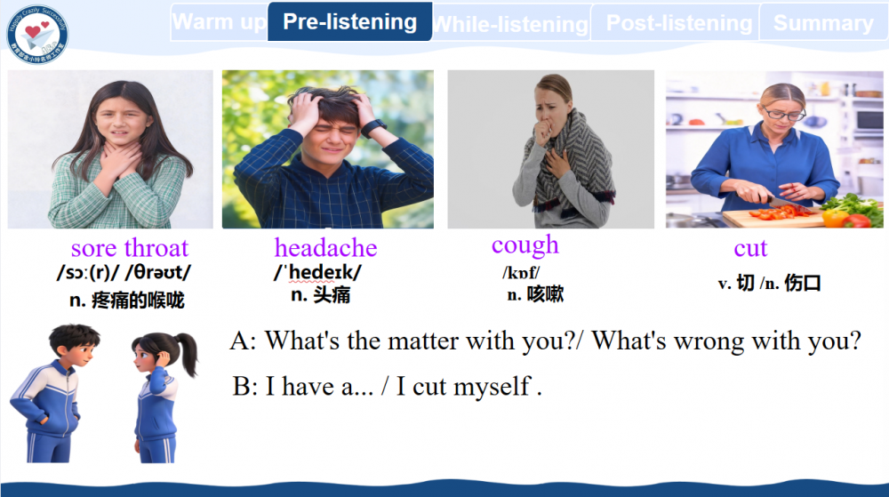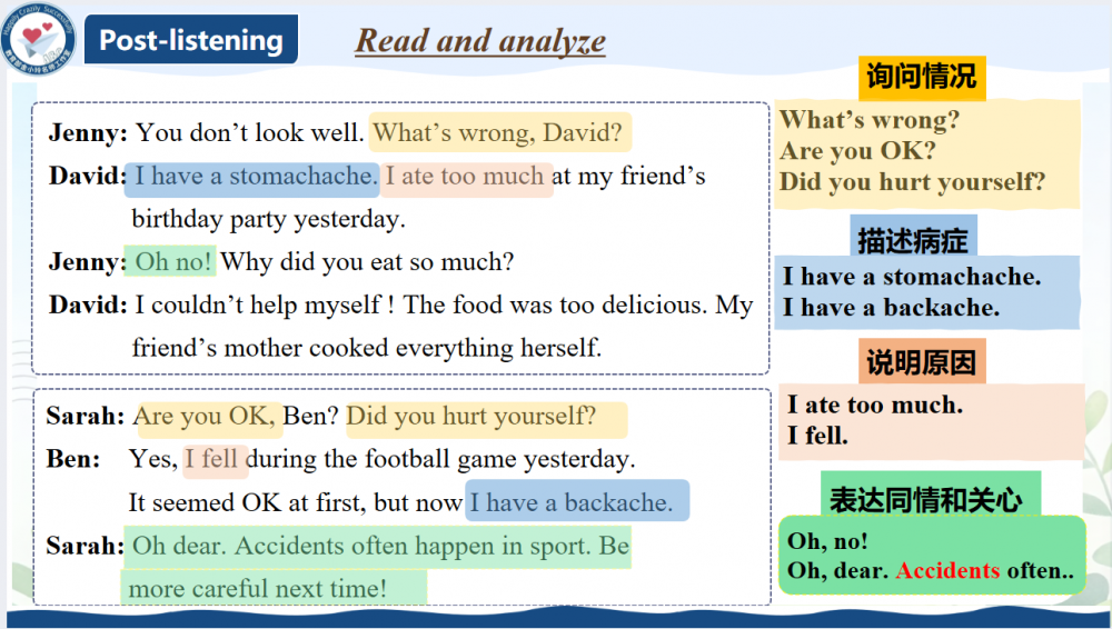 2. 情境化交际设计底部核心句型以对话模板(A: What’s wrong with you? B: I have a stomachache... A: You should go to the doctor...)呈现,模拟 “关心他人健康 — 询问病情 — 给出建议” 的真实生活场景,让学生在语境中感知语言功能,避免机械记忆,符合 “情境教学” 的要求。