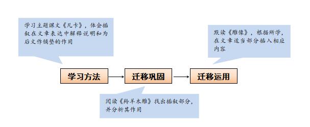 迁移运用,步步推进:我们以插叙手法的学习为例,来说明这种方式的主要流程。在分析《凡卡》一文时,我们依据确定方法的两个原则:文章最主要的写作方法和五年级学生的年段特点,确定的方法为插叙手法,并以插叙为核心整合了两篇课外文章《雕像》和《羚羊木雕》。