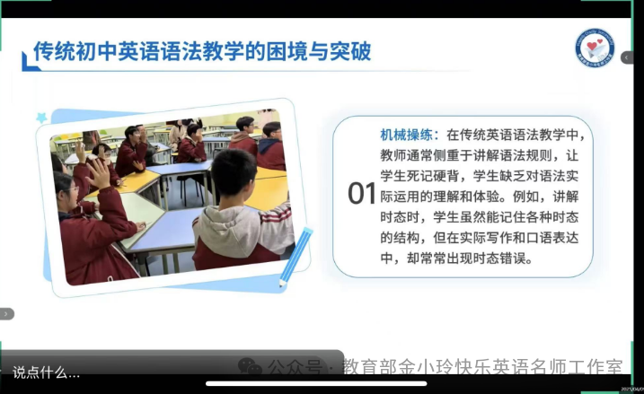 在探索英语教学的漫漫长路上,我始终怀揣着对新方法、新理念的热忱与渴望。4月13日我有幸听取了湖南特级教师罗军老师关于“三维动态语法观”视域下初中英语语法教学重构的讲座,于我而言,恰似一场及时雨,润泽了我在语法教学中略显干涸的思维田野,为我带来了诸多全新且极具价值的感悟。