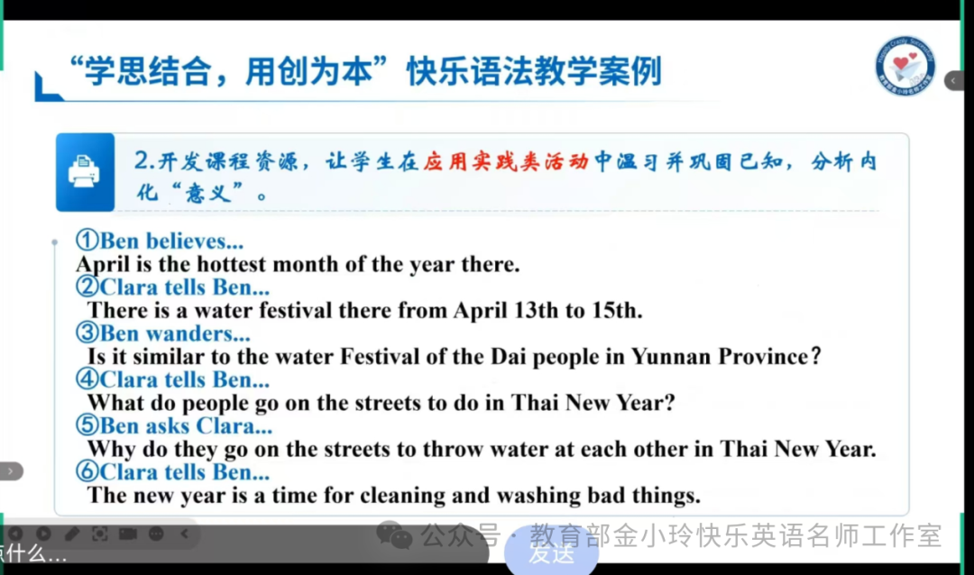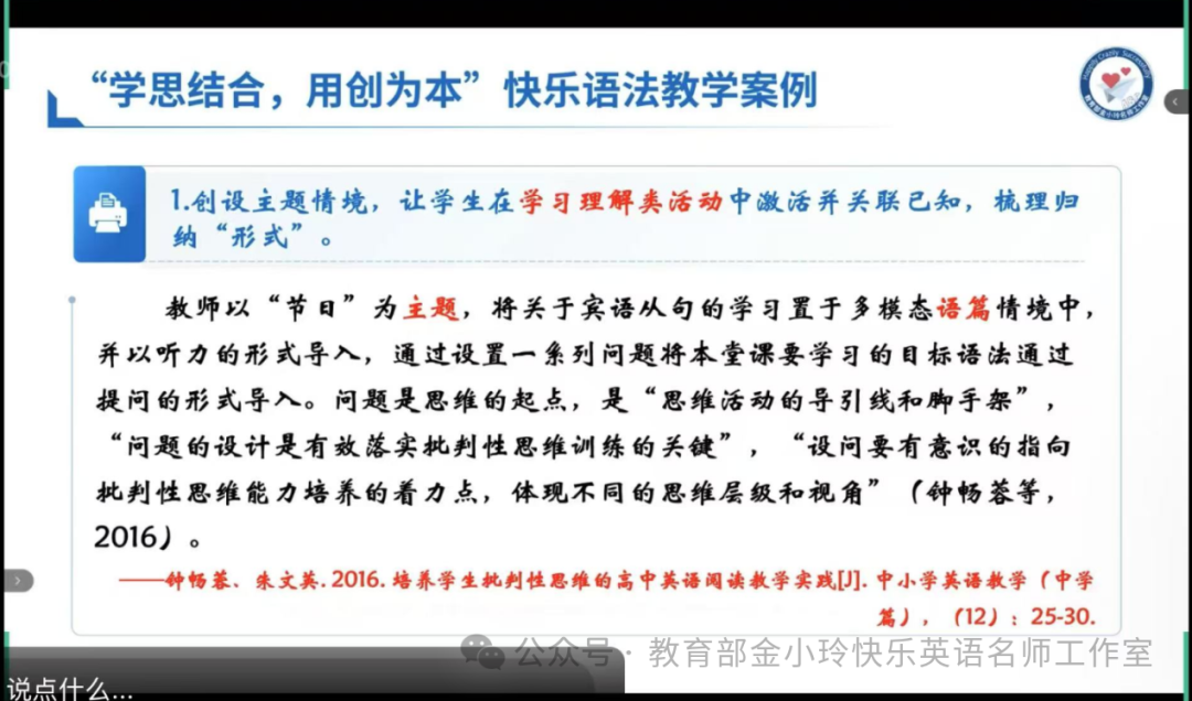 讲座初始,罗军老师那纯正地道的发音、自然流畅的语调,瞬间将我带入了一个充满魅力的英语世界。他在讲解“学思结合,用创为本”的快乐语法教学案例时,那些原本晦涩难懂的教学理念,在他生动形象的表述下,变得鲜活灵动起来。在教授宾语从句时,他设计的角色扮演和情景对话活动,让学生们仿佛置身于真实的语言场景之中,不仅轻松地理解了宾语从句的结构和用法,还在互动中感受到了英语学习的乐趣。这让我深刻地认识到,教师的语言素养是营造快乐英语课堂的关键因素之一。它如同一块强大的磁石,能够紧紧吸引学生的注意力,激发他们内心深处对英语学习的热情,使他们在愉悦的氛围中主动探索知识。