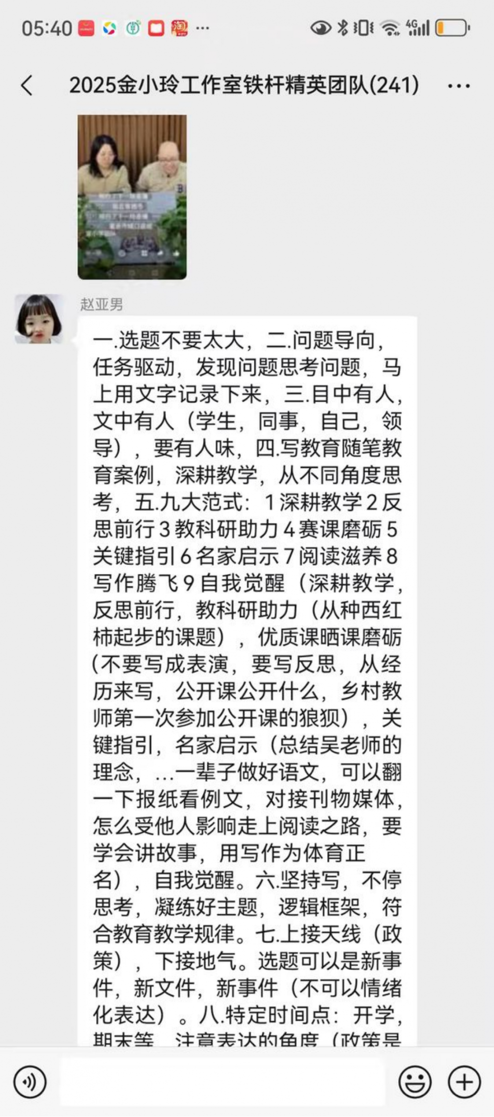 直播的余温,在各协办团队的群聊里凝成了滚烫的共鸣。老师们的分享如星子落满屏:有人说“终于敢提笔了——原来课堂上那声意外的笑、种植角那株西红柿的抽芽,都是最好的题眼”;有人言“原来随笔不是‘闲笔’,是藏着教育温度的自留地”;更有教育部新时代“双名计划”金小玲快乐英语名师工作室的成员们,在群中约定以“英语课堂的微叙事”为锚点,让写作与教学如双生花般共绽。