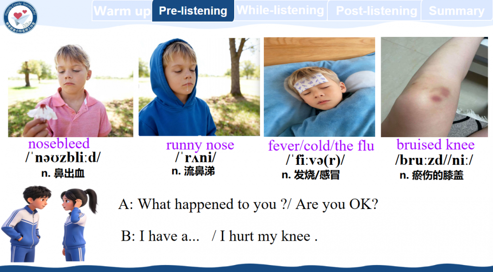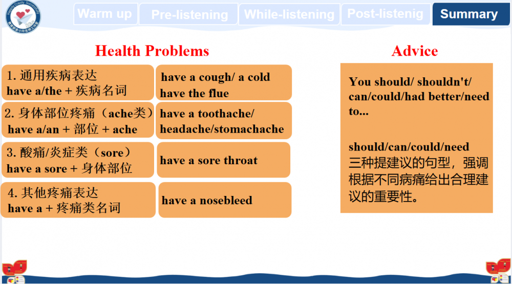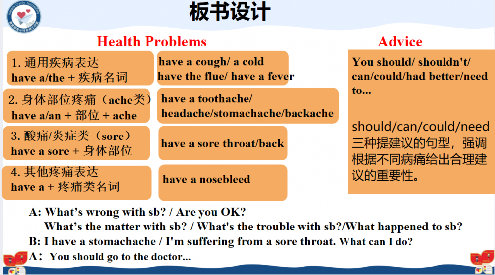 2. 情境化交际设计底部核心句型以对话模板(A: What’s wrong with you? B: I have a stomachache... A: You should go to the doctor...)呈现,模拟 “关心他人健康 — 询问病情 — 给出建议” 的真实生活场景,让学生在语境中感知语言功能,避免机械记忆,符合 “情境教学” 的要求。